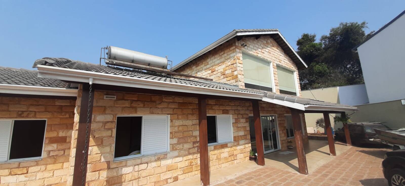 São 3 dormitórios, sendo 1 suíte mais 1 banheiro, sala 2 ambientes, persianas elétricas, sala de estar, cozinha com móveis planejados, sala de estar com escritório, na parte de cima uma sacada e escritório., varanda, área de serviço coberta, canil, esquecimento solar, energia solar, piscina de alvenaria com trocado de calor e leds, área gourmet com churrasqueira, forno e fogão à lenha, pia granito, banheiro, sala de estar de vidro, jardim, estacionamento para 8 carros e jardim, canil, água Sabesp, murada e asfalto na porta.